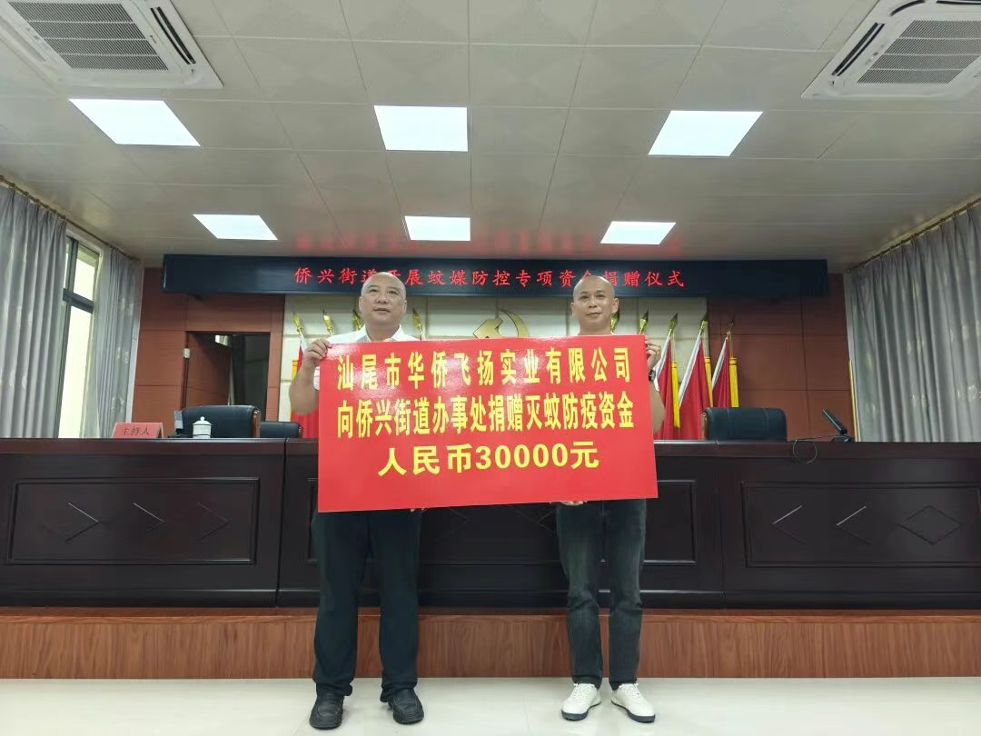 在侨兴街道的积极号召下,汕尾市华侨飞扬实业有限公司作为侨区“本土”企业,董事长杨育龙迅速响应,主动捐赠蚊媒防控专项资金共计人民币叁万元整。此项资金将专项用于购买高效氯氰菊酯、蚊香、杀虫剂、驱蚊水、花露水、喷水壶、防毒面具等疫情防控物资,为辖区蚊虫防控工作提供有力支撑。