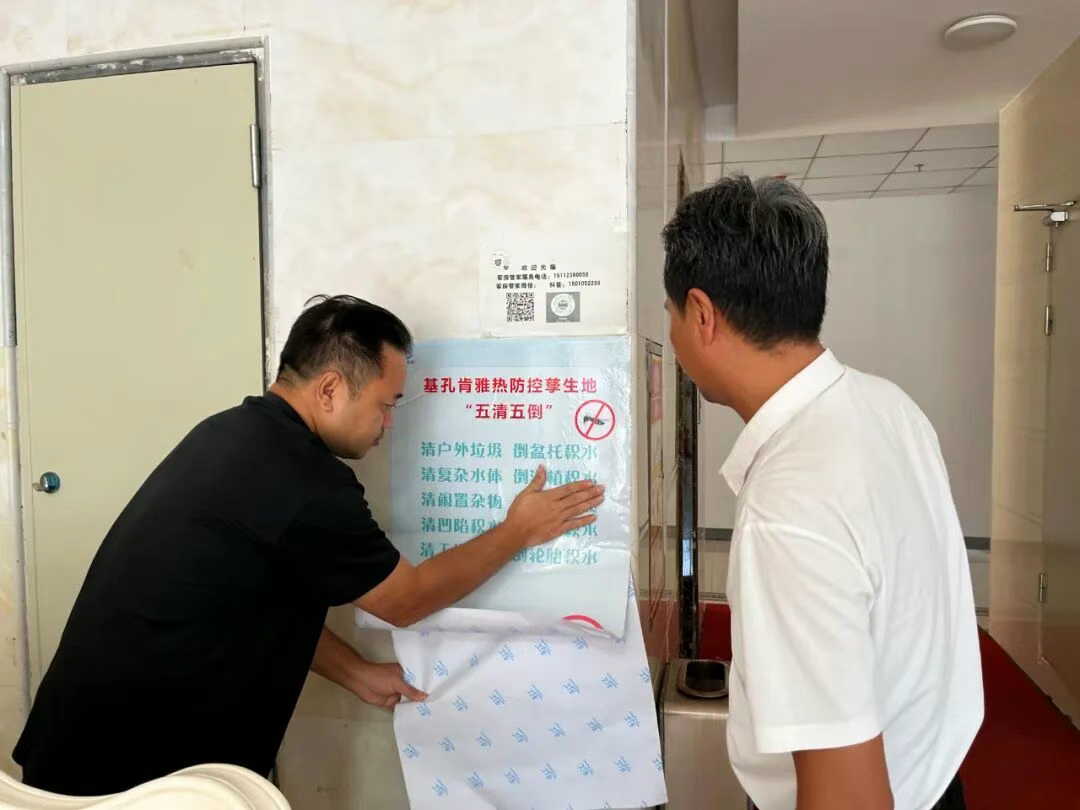 检查过程中,工作组直奔各住宿场所前台、客房、公共区域等关键点位,向经营负责人及前台工作人员阐明当前防控工作要求,明确住宿场所作为外来人员入区“第一接触点”的责任定位,督促其紧绷防控之弦。同时,现场发放《宾馆饭店蚊虫控制指引》《常见伊蚊孳生地类型处置方法》等实操资料,并协助在前台登记处、电梯口、楼道公告栏等醒目位置张贴防控宣传海报,确保旅客和工作人员随时能看、随时能学,切实提升防控知识知晓率。