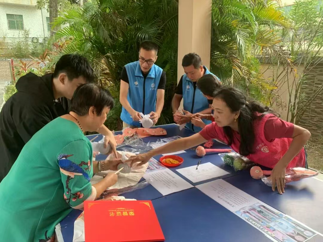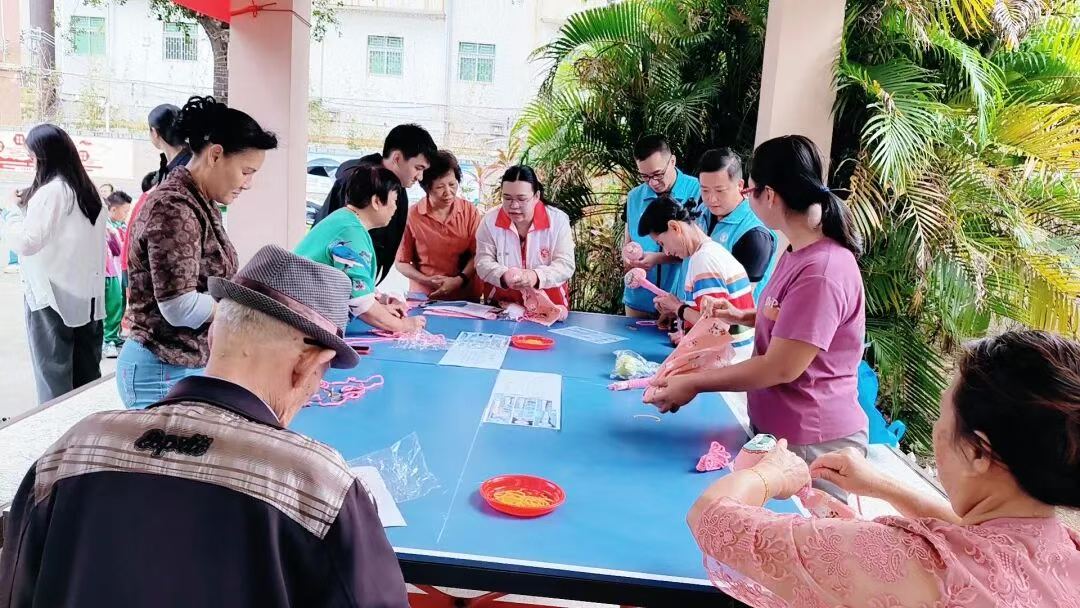 活动现场暖意融融,“孝亲敬老”主题贯穿始终。多项精心设计的互动环节,让这份温暖与敬意看得见、触得着。工作人员向社区群众细致解读养老服务、侨界帮扶等相关政策,用通俗语言解答大家关心的养老保障问题;在手工体验区,志愿者手把手指导群众制作艾草捶,揉搓、填充、缝合,一个个散发着艾草清香的捶具,成为传递健康的实用礼物;心愿卡书写区更是温情满溢,孩子们认真绘制、书写对爷爷奶奶的祝福,随后双手将亲手制作的节日祝福卡送到老人们手中,轻声送上“重阳安康”的诚挚问候,老人们接过卡片细细品读,脸上都绽放出欣慰的笑容,现场满是温馨互动的动人画面。