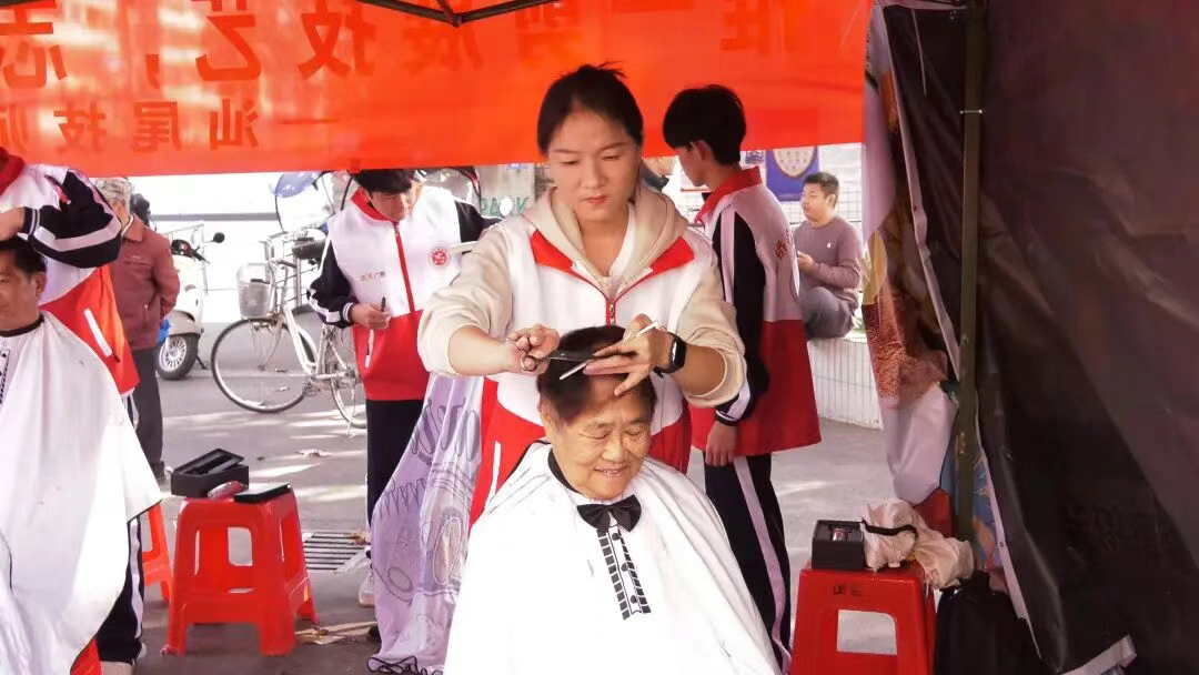 爱心义剪摊位前人头攒动,老年群体和亲子家庭踊跃参与。汕尾技师学院的青年理发师们专业细致、热情周到,一边娴熟修剪发型,一边与老人亲切拉家常,现场欢声笑语不断。青年志愿者化身“贴心引导员”,有序维护现场秩序,主动询问群众需求、提供便民服务。理完发的老人们对着镜子端详新发型,纷纷露出满意笑容,连声向志愿者致谢。