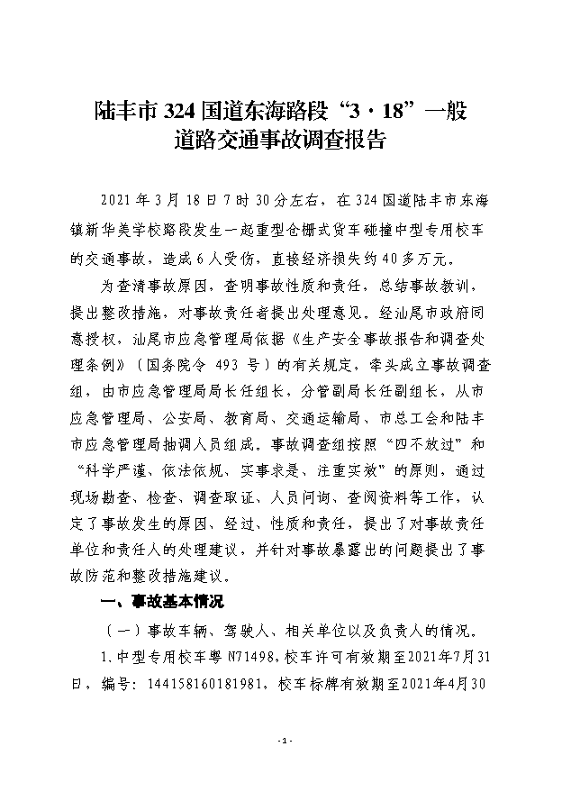 陆丰市324国道东海路段“3·18”一般道路交通事故调查报告