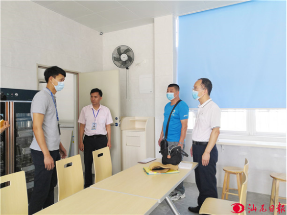 近日,市市场监管局华侨管理区分局执法人员检查侨区一学校新建成的食堂,对发现的未设衣帽间、留样间的问题提出改进意见,并借此加强教育引导,要求做好食堂食品安全管理和隐患排查工作,给师生提供“放心餐”。(汕尾日报记者彭伟栋摄)