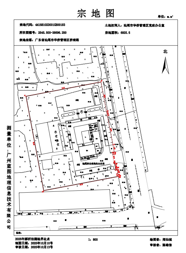 经实测,该项目门牌地址为广东省汕尾市华侨管理区侨南路,用地面积6925.5平方米,建筑面积为2666.80平方米,共计有2幢、地上3层、地下0层(详见附图、附表)。