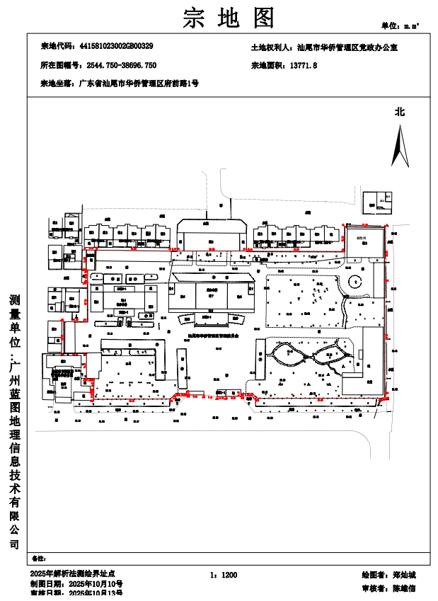 经实测,该项目门牌地址为广东省汕尾市华侨管理区府前路1号,用地面积13771.8平方米,建筑面积为7437.64平方米,共计有7幢、地上7层、地下0层(详见附图、附表)。