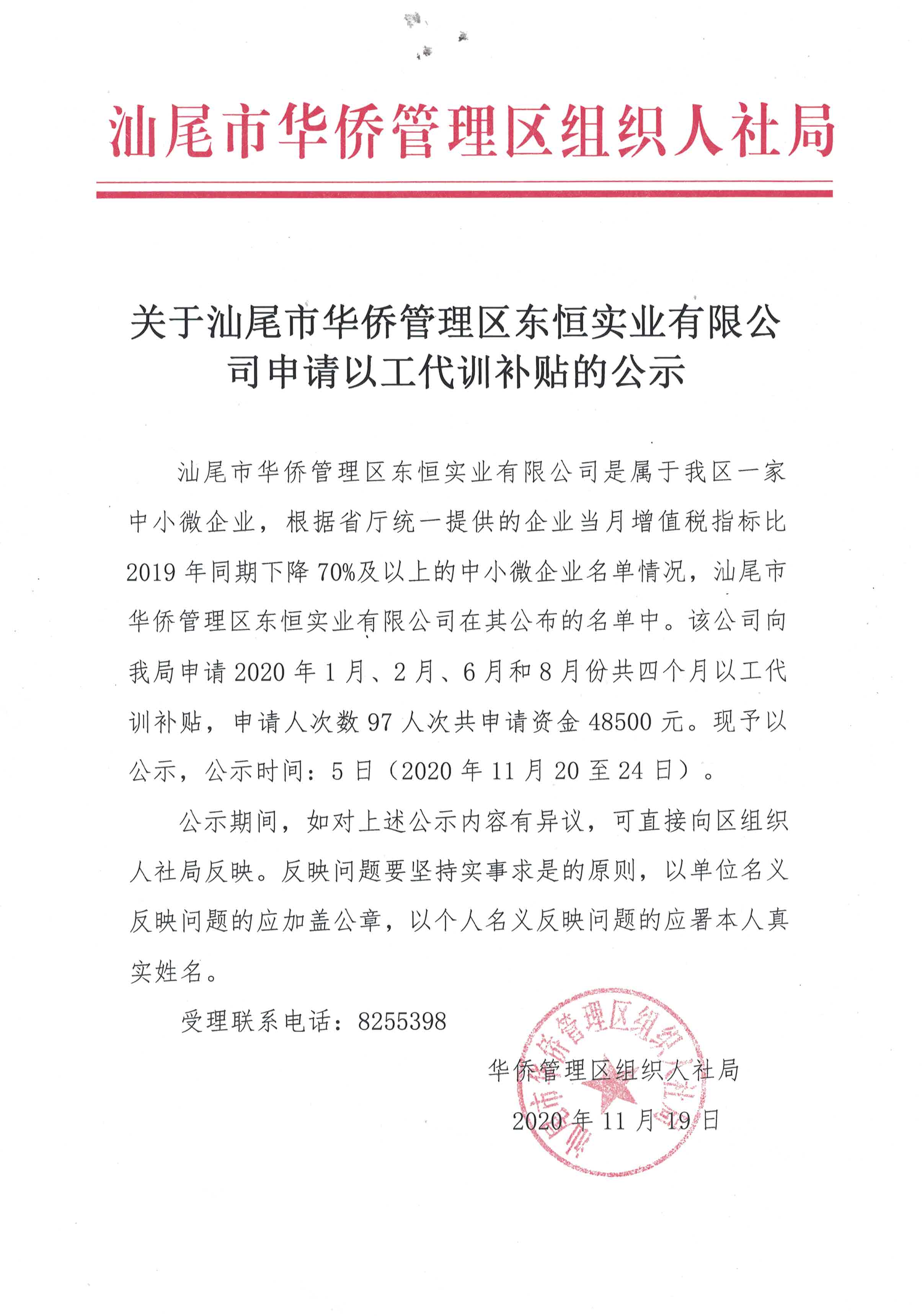 关于汕尾市华侨管理区东恒实业有限公司申请以工代训补贴的公示-电玩城下载