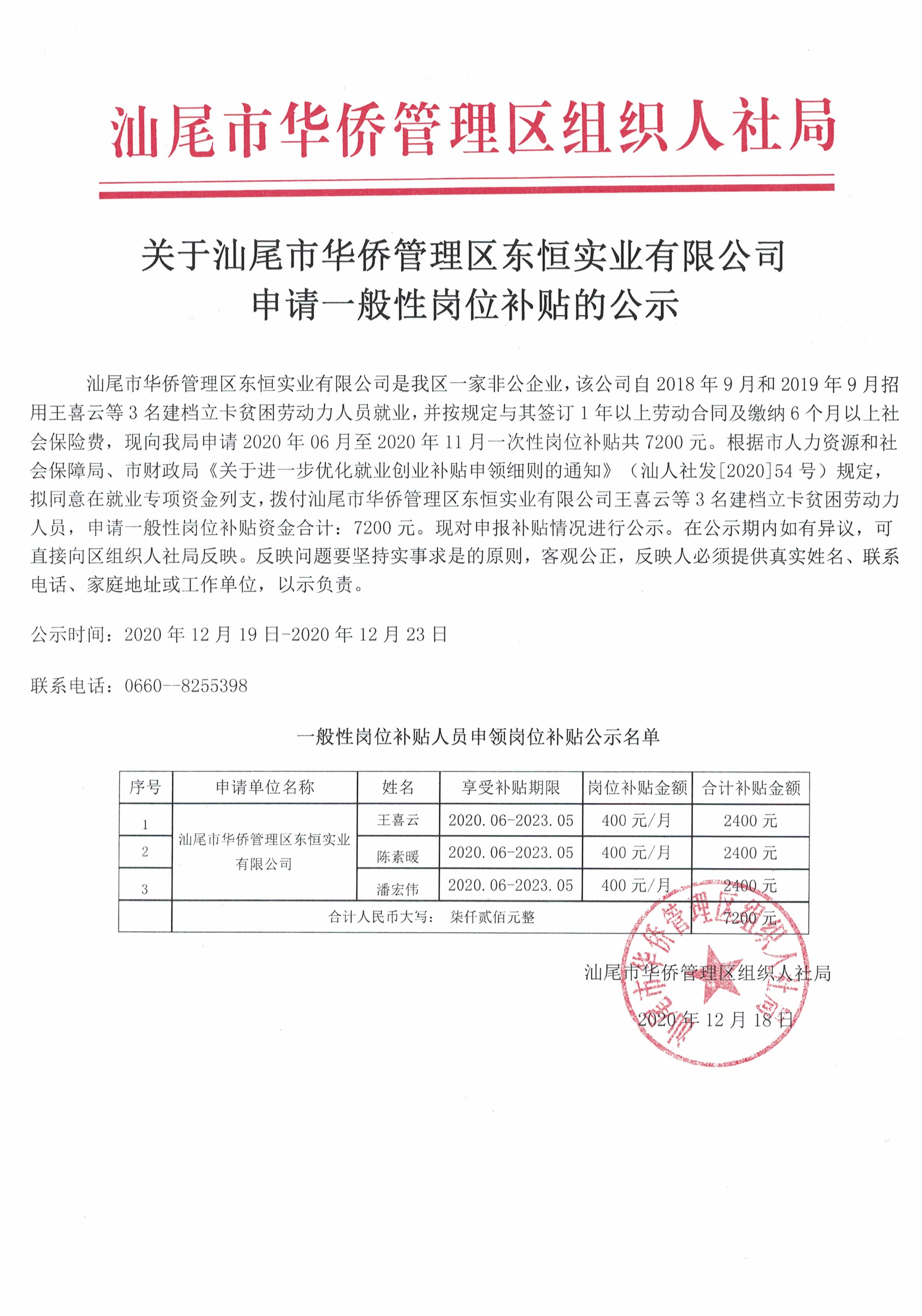 关于汕尾市华侨管理区东恒实业有限公司申请一般性岗位补贴的公示