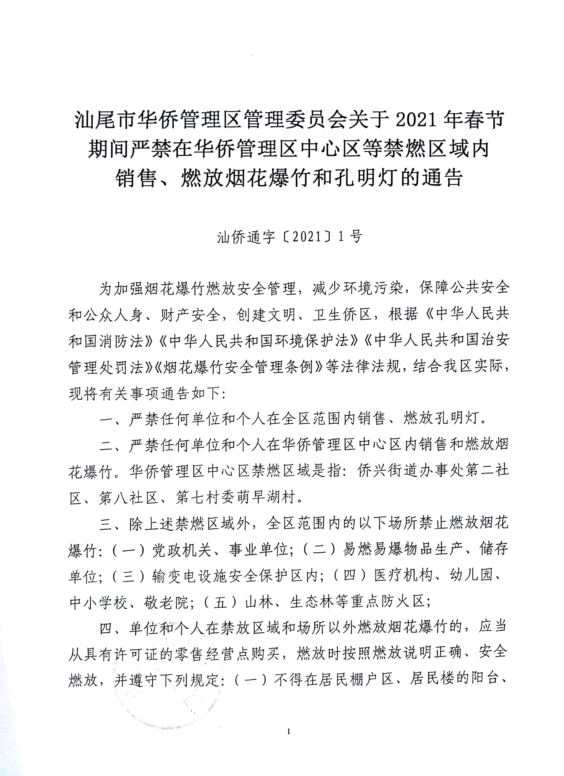 汕尾市华侨管理区管理委员会关于2021年春节期间严禁在华侨管理区中心区等禁燃区域内销售、燃放烟花爆竹和孔明灯的通告