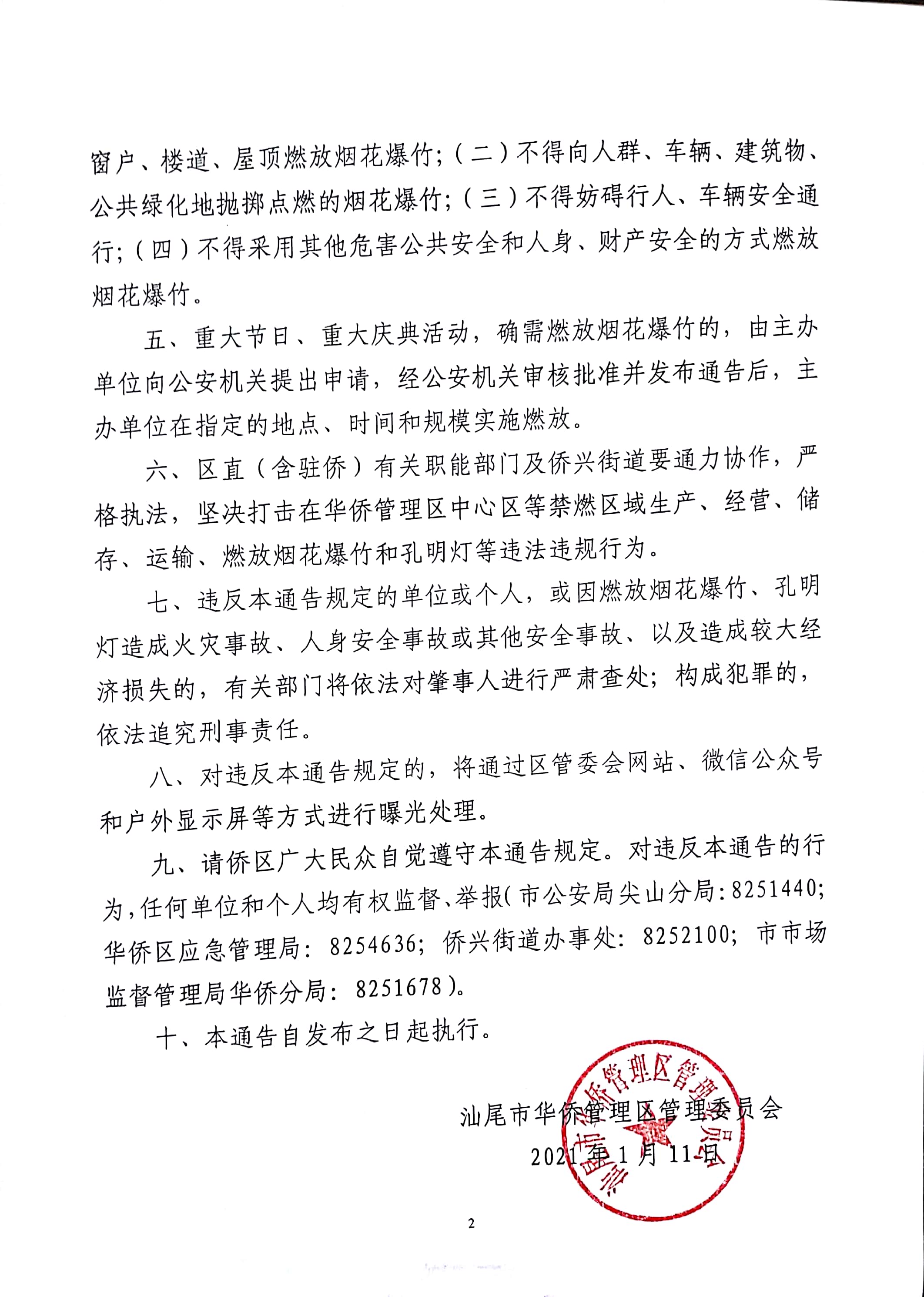 汕尾市华侨管理区管理委员会关于2021年春节期间严禁在华侨管理区中心区等禁燃区域内销售、燃放烟花爆竹和孔明灯的通告-电玩城下载